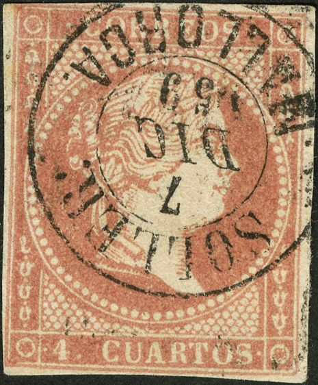 48. 1856. 4 cuartos rojo. Matasello SOLLER / MALLORCA. MAGNIFICO.