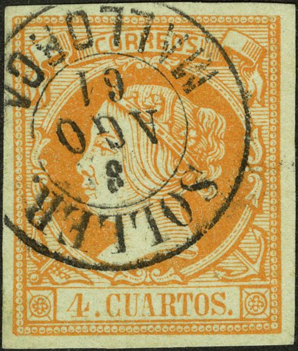 52. 1860. 4 cuartos amarillo. Matasello SOLLER / MALLORCA.