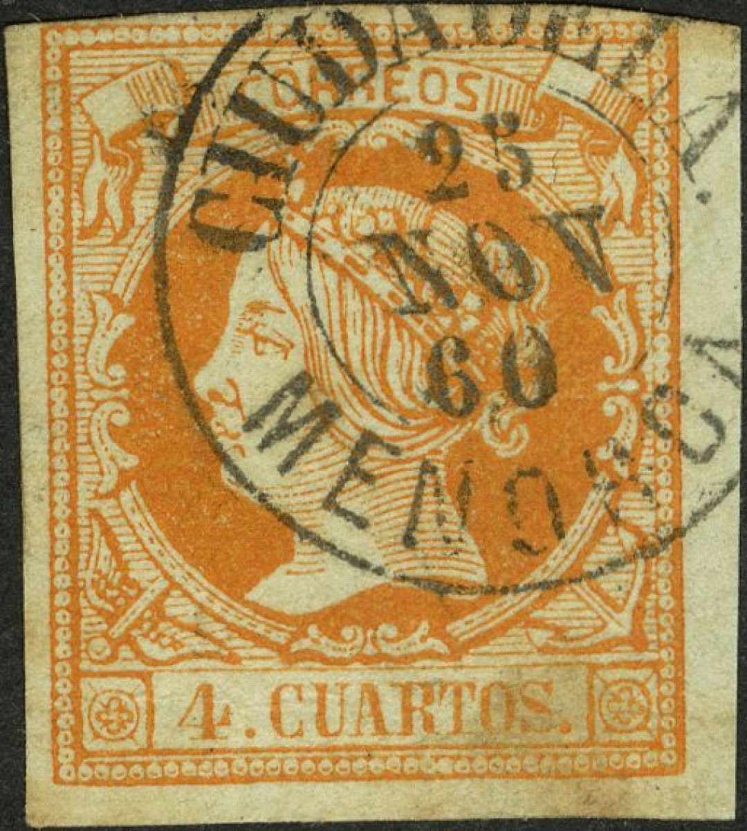 52. 1860. 4 cuartos amarillo. Matasello CIUDADELA / MENORCA.