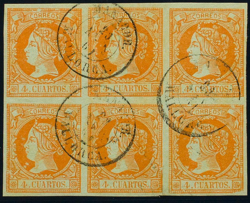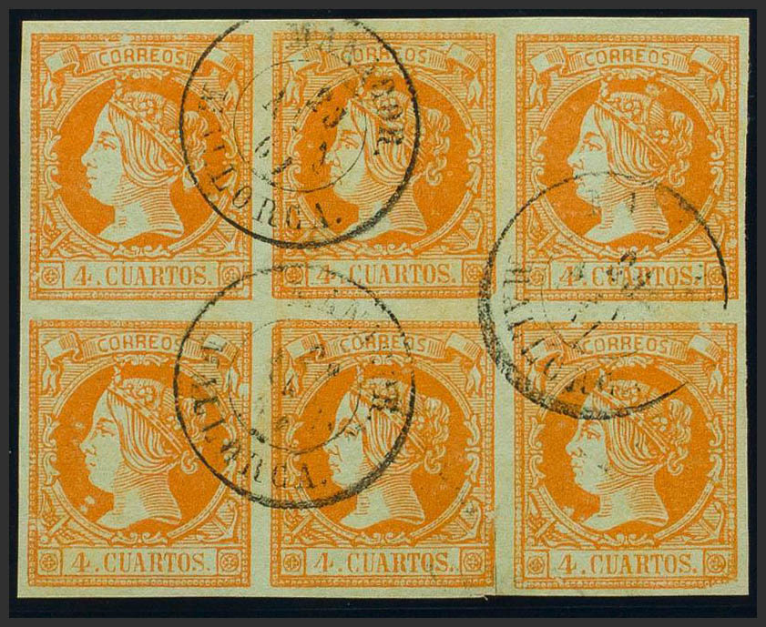 52(6). 1860. 4 cuartos naranja, bloque de seis. Matasello MANACOR / MALLORCA. MAGNIFICO Y RARO.