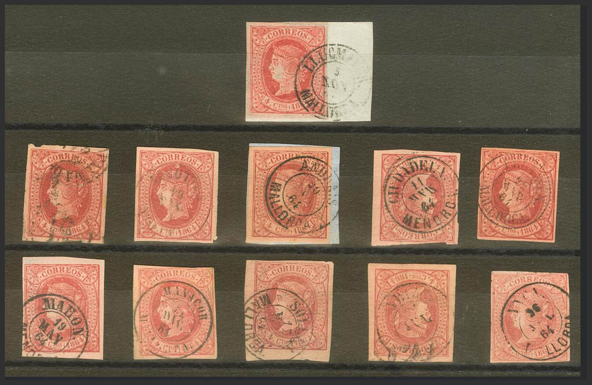 64(11). 1864. Conjunto de once sellos del 4 cuartos rojo con fechadores de las Islas Baleares (todos con buenas estampaciones), destacan ANDRAIS / MALLORCA, FELANITX / MALLORCA ó SOLLER / MALLORCA. MAGNIFICOS.