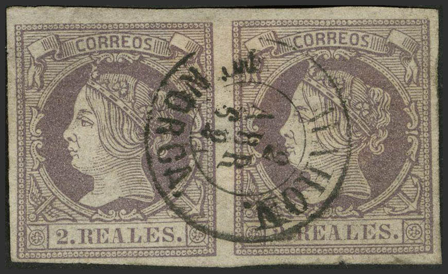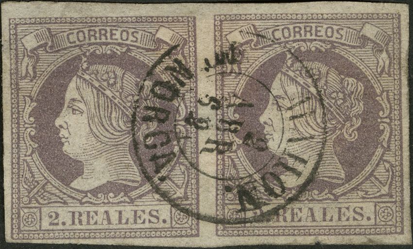 56(2). 1860. 2 reales lila, pareja. Matasello MAHON / MENORCA. MAGNIFICA.