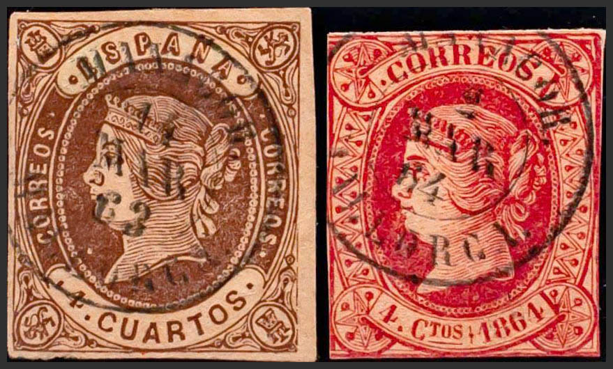 58, 64. (1862ca). Conjunto de dos sellos del 4 cuartos castaño y 4 cuartos rosa, inutilizados con matasello MANACOR / BALEARES. MAGNIFICO.