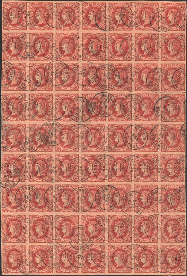 64(63). 1864. 4 cuartos rojo, bloque de sesenta y tres. Matasello MANACOR / BALEARES. MAGNIFICO Y RARISIMO BLOQUE DE ESTE TAMAÑO.