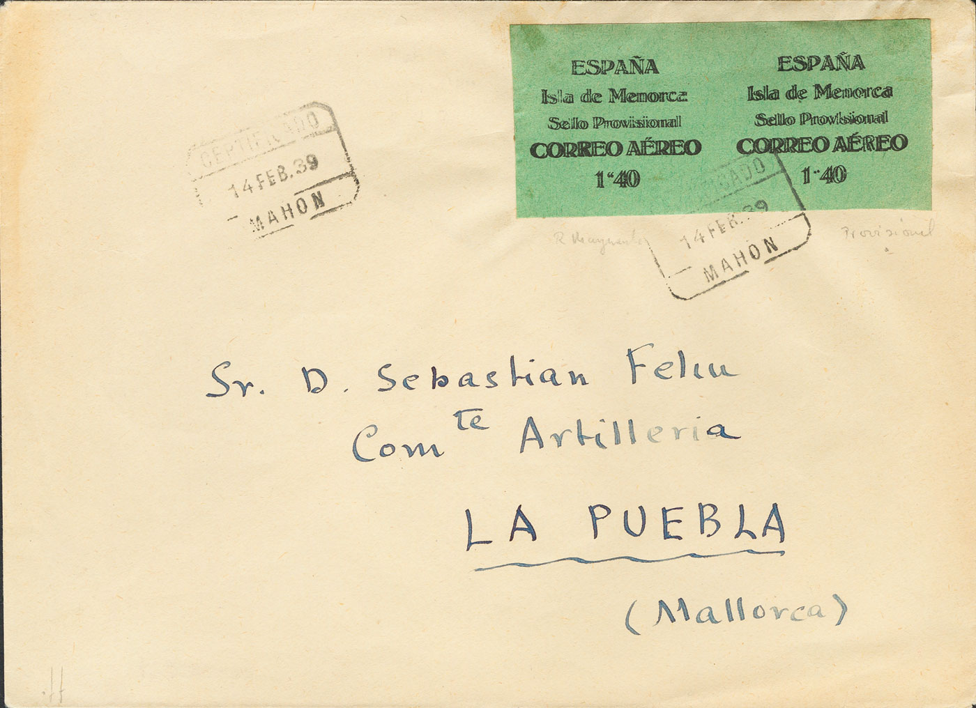 2ed(2). 1939. 1´40 cts verde, pareja DOBLE IMPRESION. MAHON a LA PUEBLA (MALLORCA). Al dorso tránsito. MAGNIFICA Y EXTRAORDINARIAMENTE RARA, MUY POSIBLEMENTE UNICA CIRCULADA ASI. Cert. GRAUS.