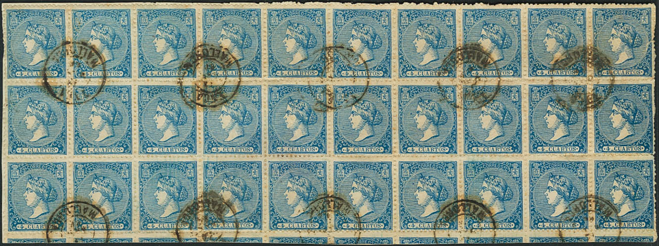 81(30). 1866. 4 cuartos azul, bloque de treinta. Matasello YNCA / MALLORCA. MAGNIFICO.