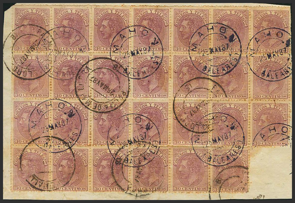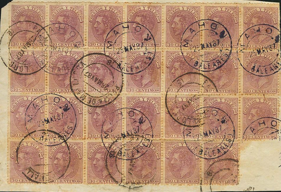 △ 211(27). 1887. 30 cts lila de veintisiete, sobre fragmento. Matasello MAHON / (BALEARES), a la salida y PALMA DE MALLORCA / (8), a la llegada. MAGNIFICO Y MUY RARO.