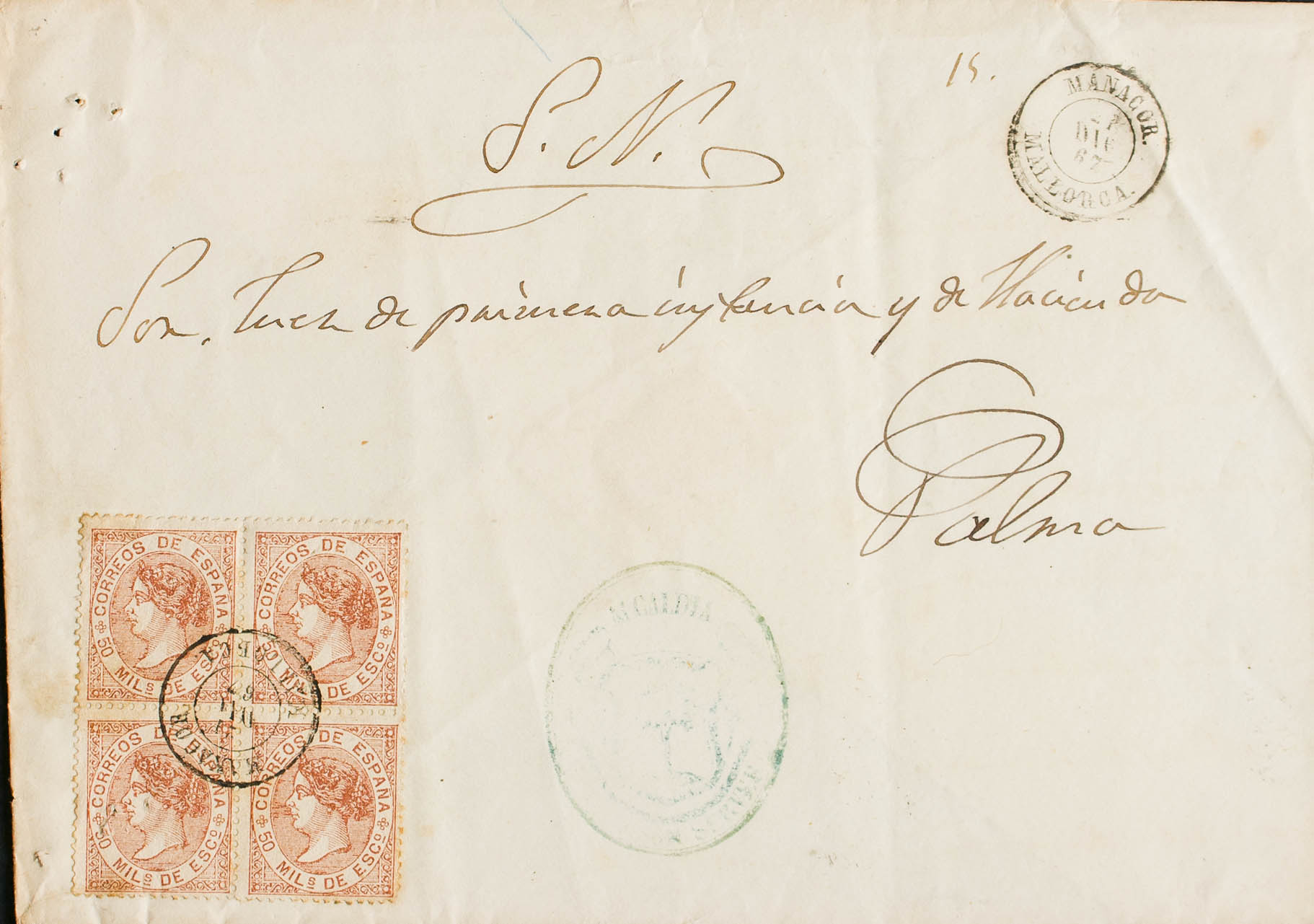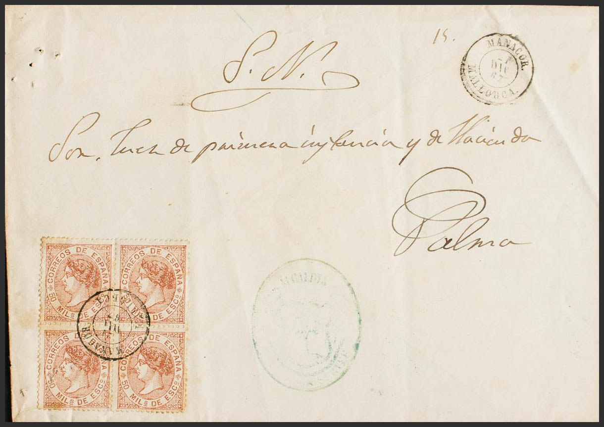 96(4). 1867. 50 mils castaño, bloque de cuatro. MANACOR a PALMA DE MALLORCA. Matasello MANACOR / MALLORCA. MAGNIFICA Y RARA.
