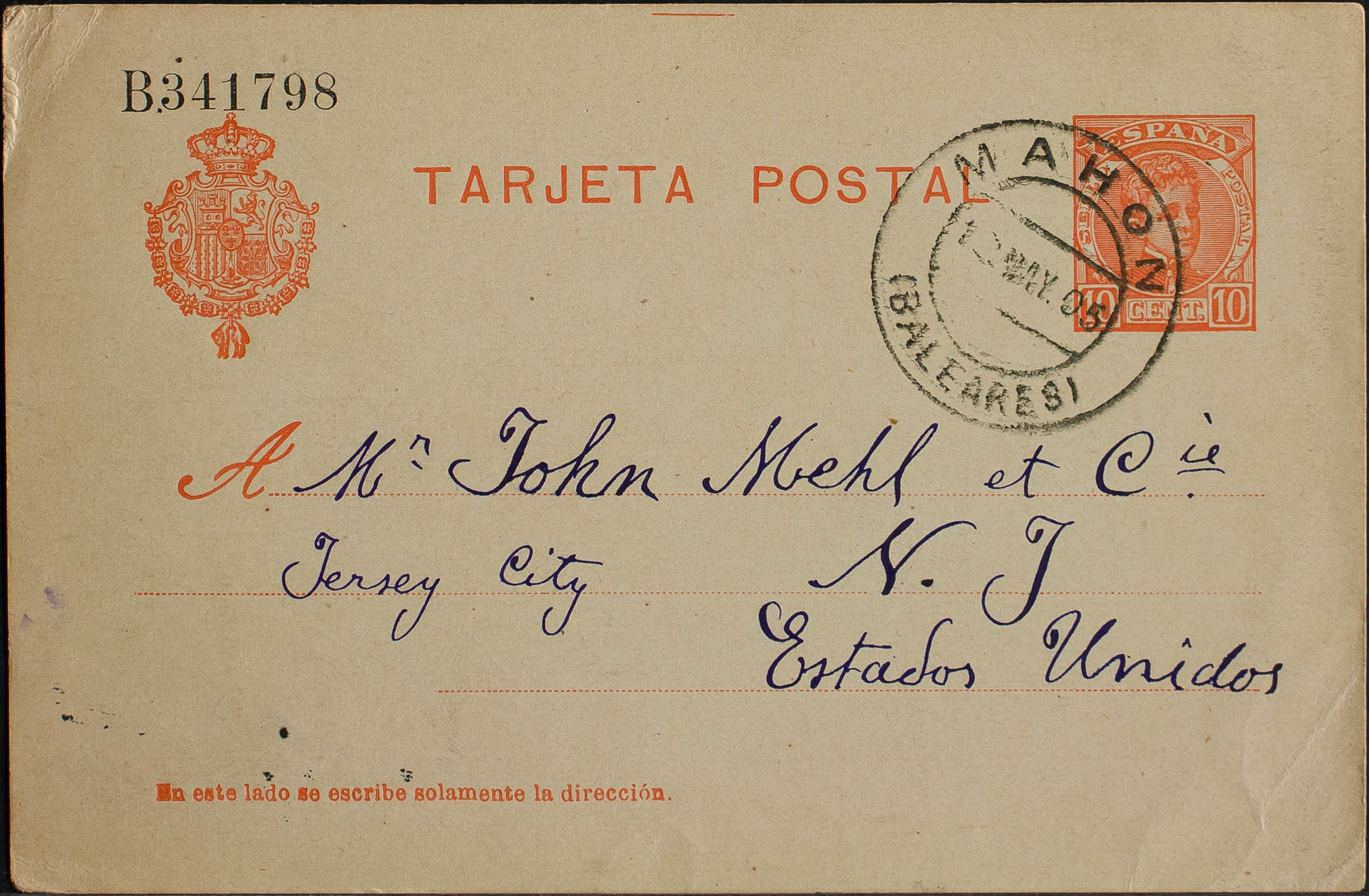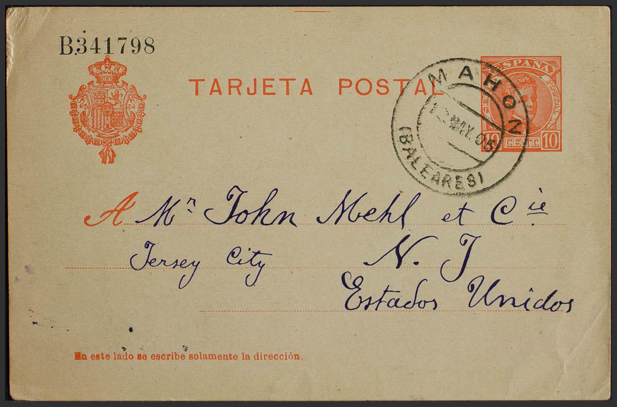 (★) EP45. 1905. 10 cts naranja sobre Tarjeta Entero Postal de MAHON a JERSEY CITY (U.S.A.). Matasello MAHON / (BALEARES). MAGNIFICA.