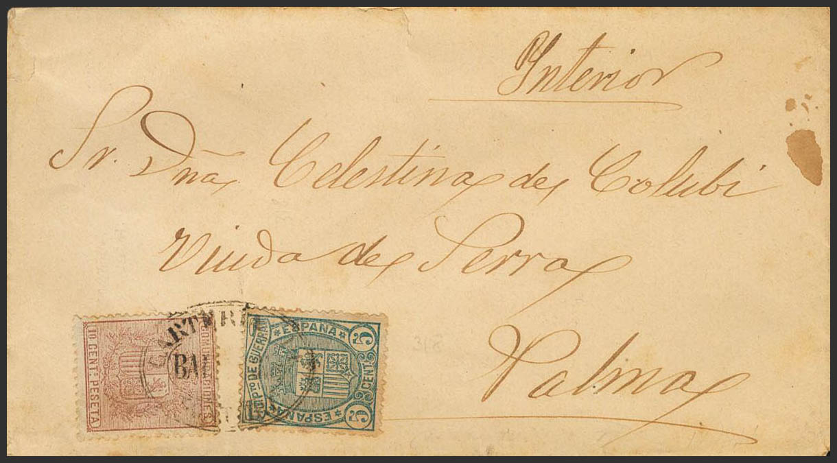 153, 154. 1875. 10 cts castaño y 5 cts verde. MONTURI (BALEARES) a PALMA DE MALLORCA. Matasello especial CARTERIA DE / BALEARES / MONTURI. MAGNIFICA Y RARISIMA.