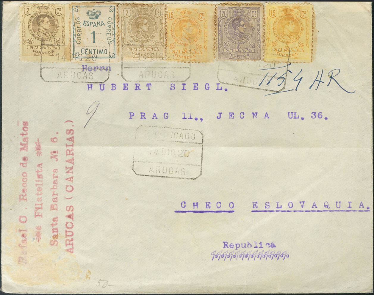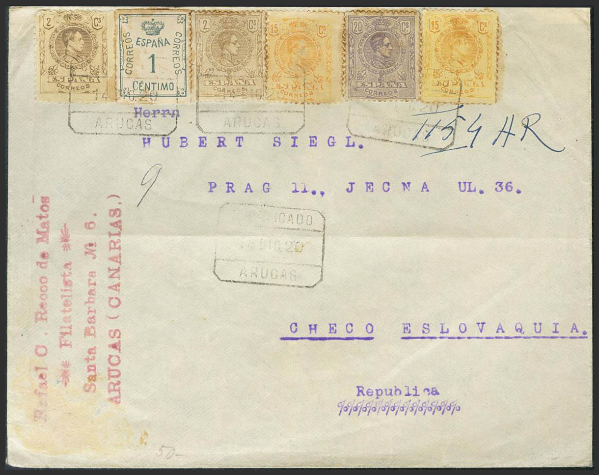 289/90, 267, 271(2), 291. 1920. Serie completa, 2 cts castaño, 15 cts amarillo, dos sellos y 1 cts verde. Certificado de ARUCAS (LAS PALMAS) a PRAGA (CHECOSLOVAQUIA). En el frente membrete del coleccionista Rafael C.Recco de Matos y al dorso llegada. BONITA Y RARA COMBINACION DE FRANQUEO.