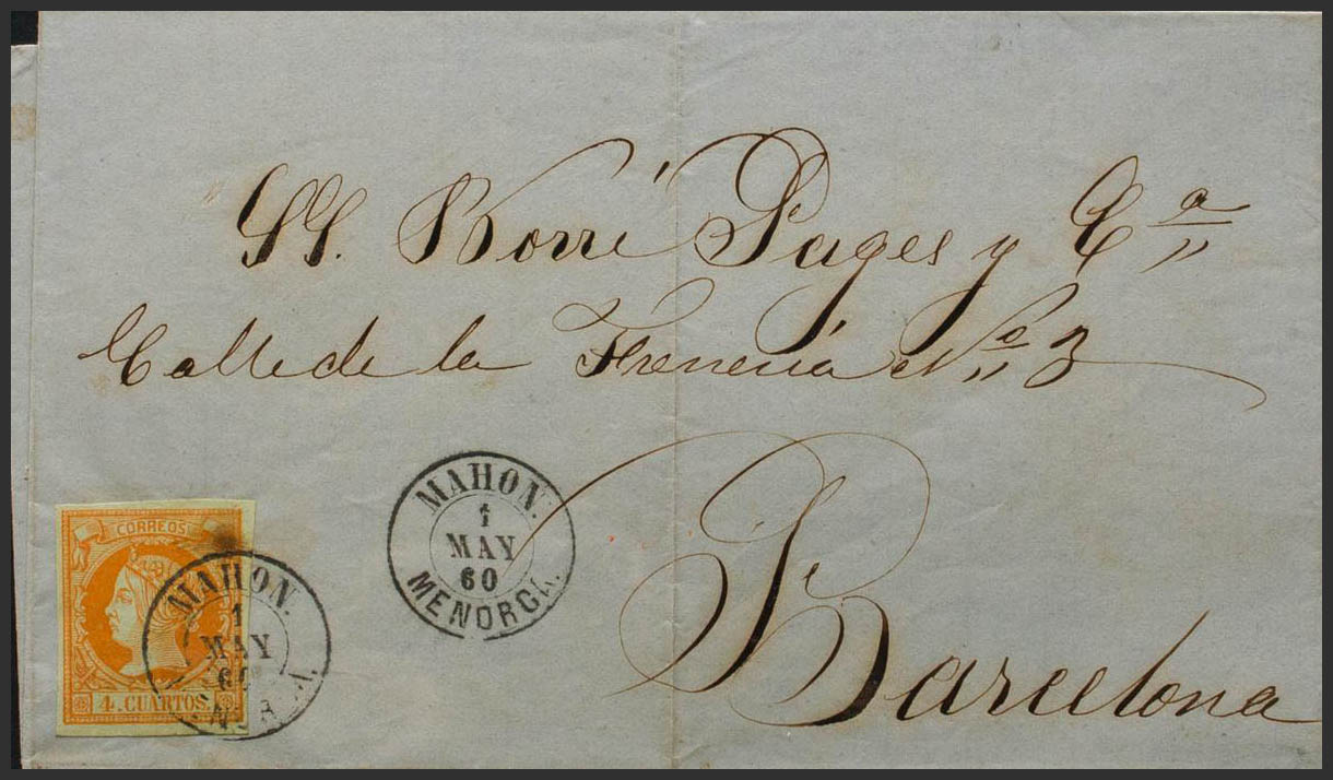 52. 1860. 4 cuartos naranja. MAHON a BARCELONA. Matasello MAHON / MENORCA. MAGNIFICA.