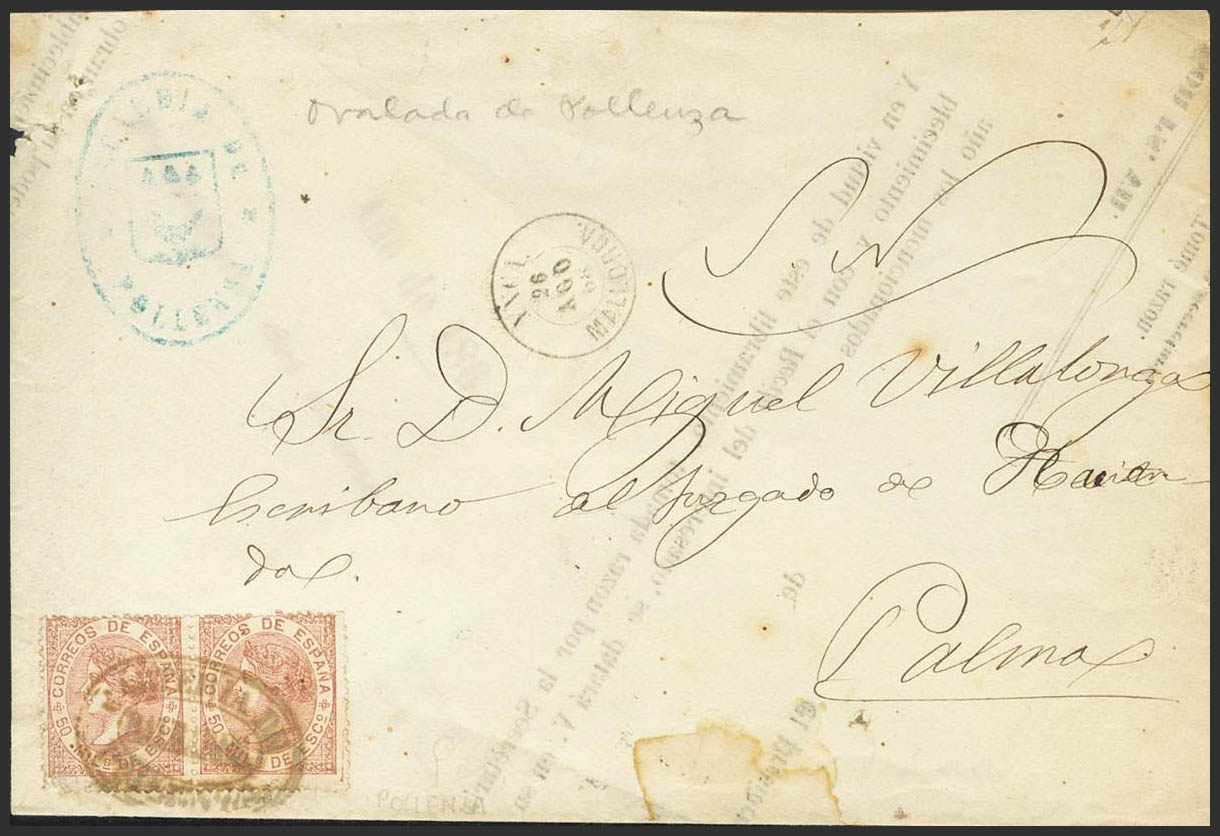 96(2). 1868. 50 mils castaño amarillo, pareja. POLLENSA (BALEARES) a PALMA DE MALLORCA. Matasello especial oval CARTERIA DE / POLLENZA. MAGNIFICA Y RARISIMA.