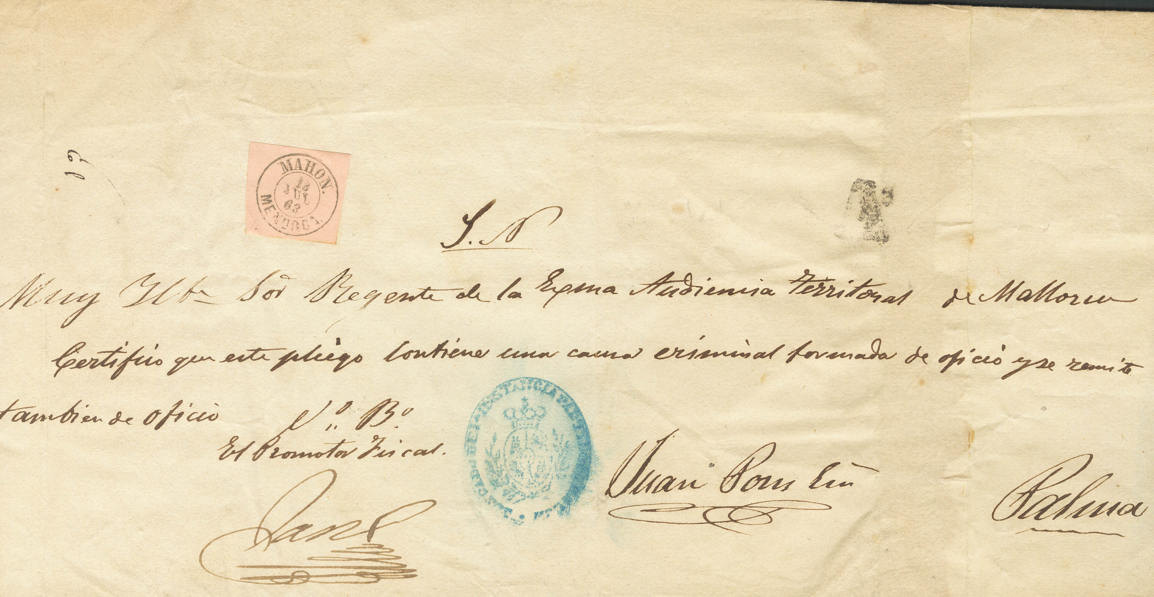1863. Fechador MAHON / MENORCA sobre borde de hoja de un sello de la emisión de 1862, utilizado provisionalmente como sustituto de un sello. Plica Judicial de MAHON a PALMA DE MALLORCA. En el frente marca "As", de abono de Mahón. MAGNIFICA Y RARISIMA.
