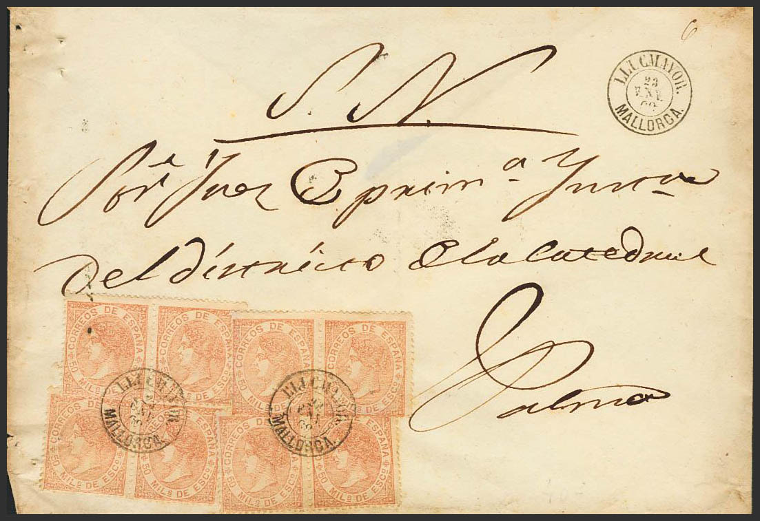 96(8). 1868. 50 mils castaño, ocho sellos. Plica Judicial de LLUCHMAYOR a PALMA DE MALLORCA. MAGNIFICA Y RARA.