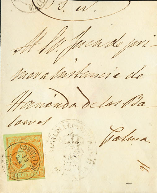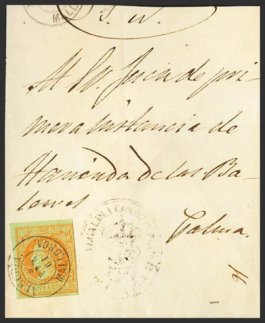 52. 1861. 4 cuartos naranja. ALCUDIA a PALMA DE MALLORCA. Matasello ALCUDIA / MALLORCA, en el frente marca ALCALDIA CONSTITUCIONAL / ALCUDIA. MAGNIFICA Y RARA.