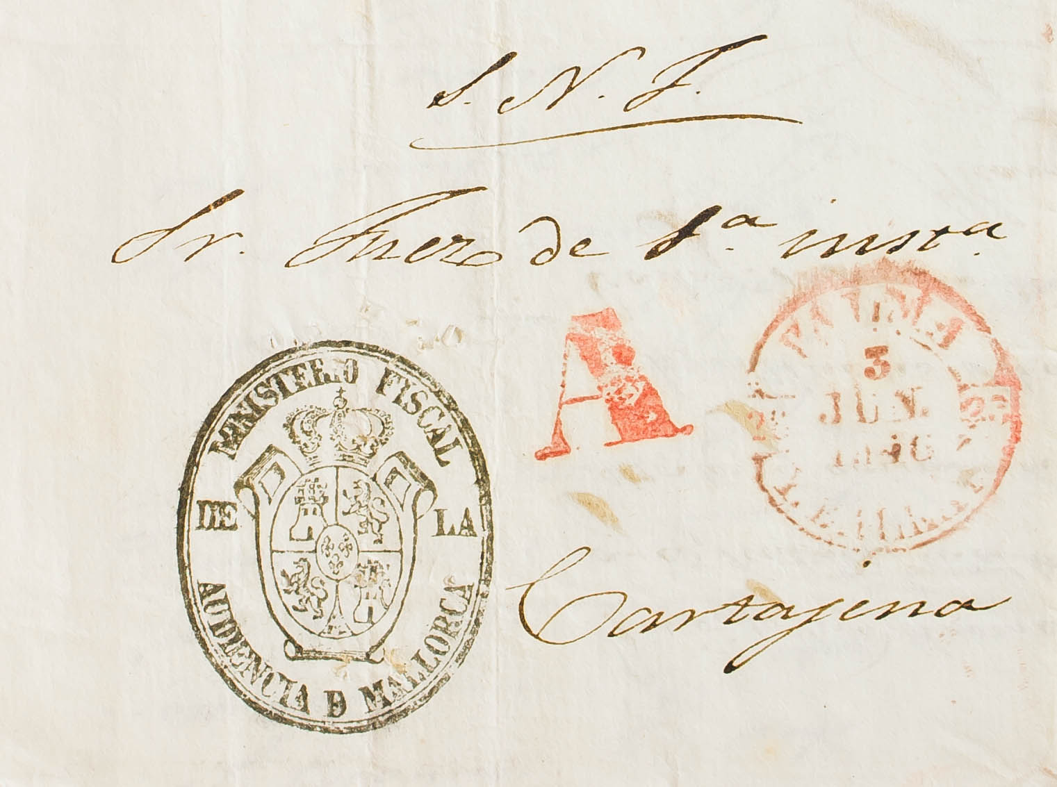 1846. PALMA DE MALLORCA a CARTAGENA. Marca "A", en rojo de Abono (P.E.22) edición 2004. MAGNIFICA.