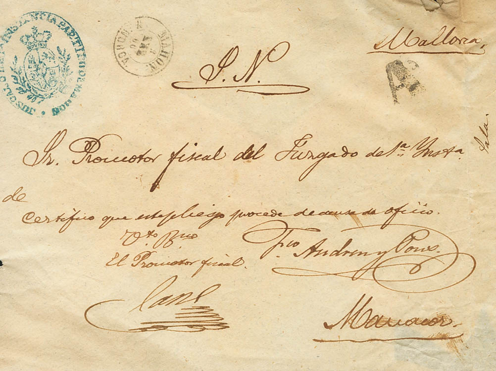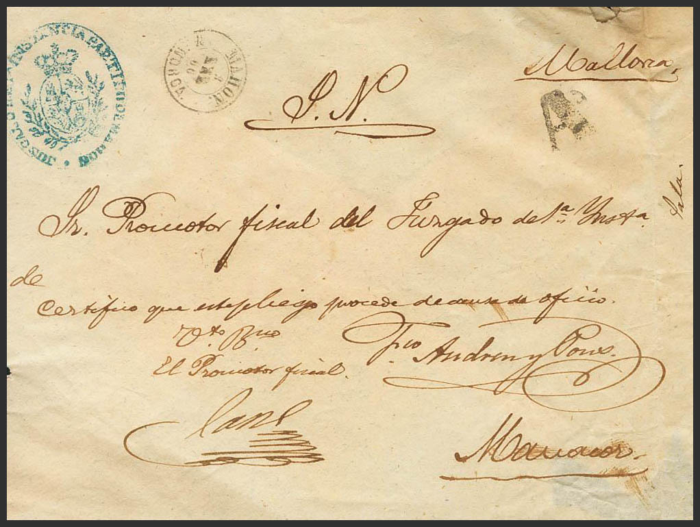 1866. Plica Judicial de MAHON a MANACOR. Marca de Abono "As", de Mahón (P.E.14) edición 2004. MAGNIFICA.