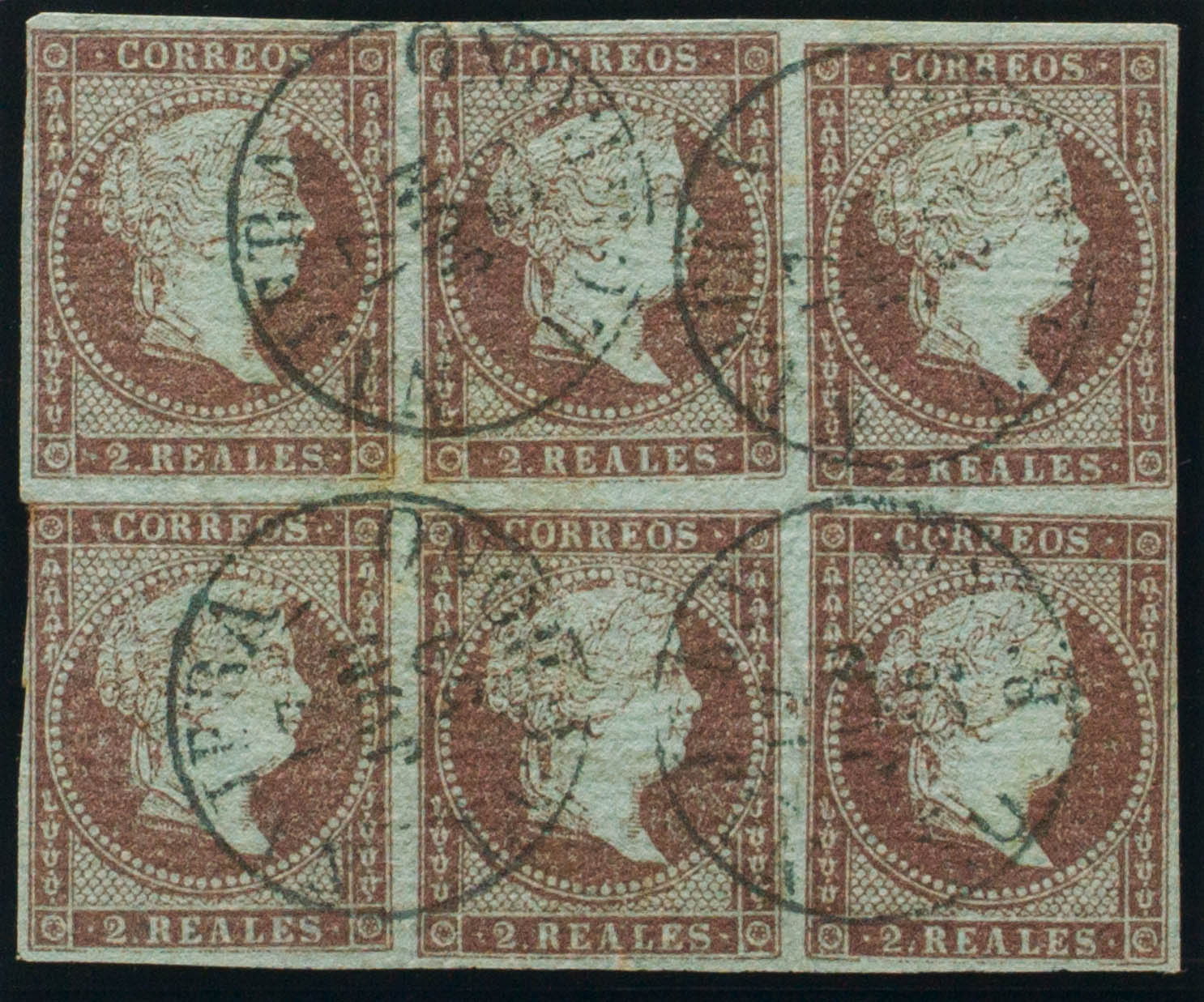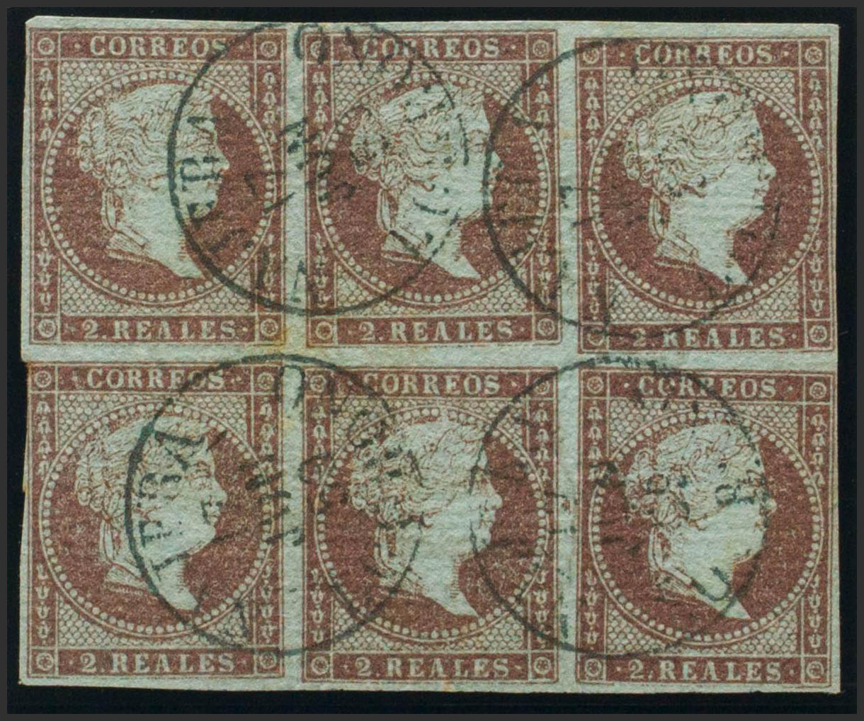 42(6). 1855. 2 reales violeta, bloque de seis (un sello margen justo). Matasello NAJERA / LOGROÑO (Tipo I). MAGNIFICO. Edifil 2014: 179 Euros