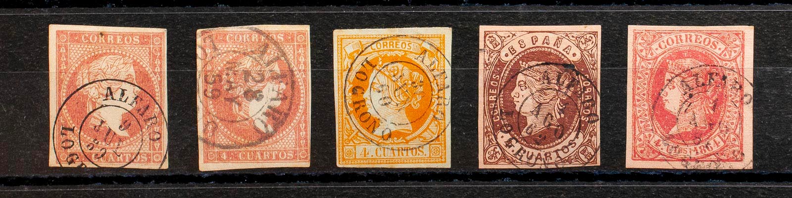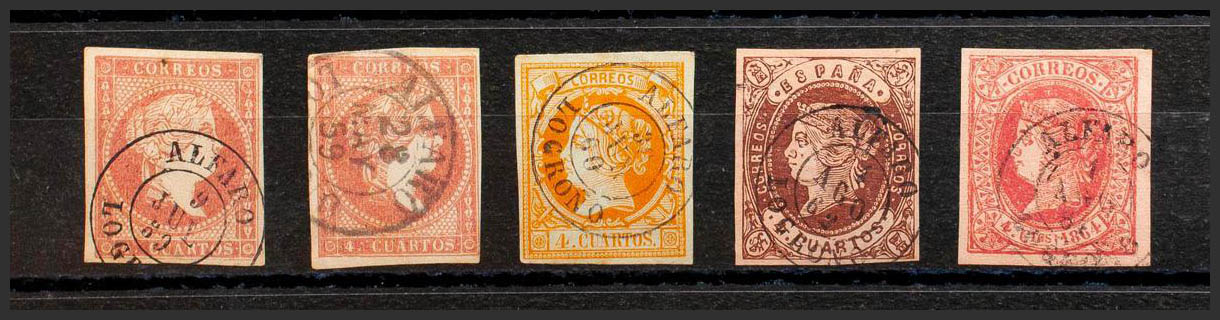 48(2), 52, 58, 64. (1855ca). Conjunto de cinco sellos del 4 cuartos rojo, amarillo, castaño y rosa, inutilizados con el matasello ALFARO / LOGROÑO (incluyendo el Tipo I sobre el 4 cuartos rojo). MAGNIFICO.