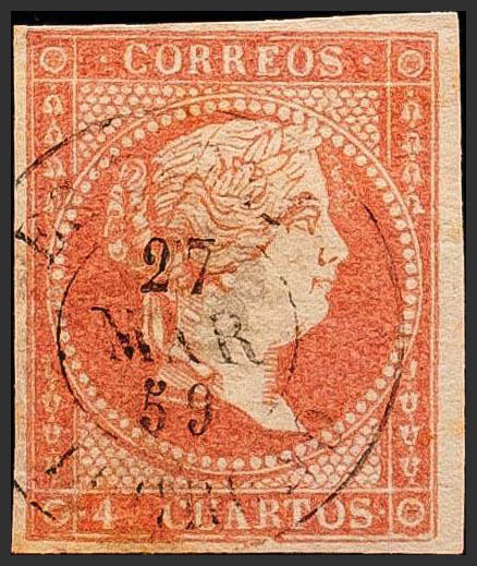 48. 1855. 4 cuartos rojo. Matasello ESCARAY / LOGROÑO. BONITO Y MUY RARO.