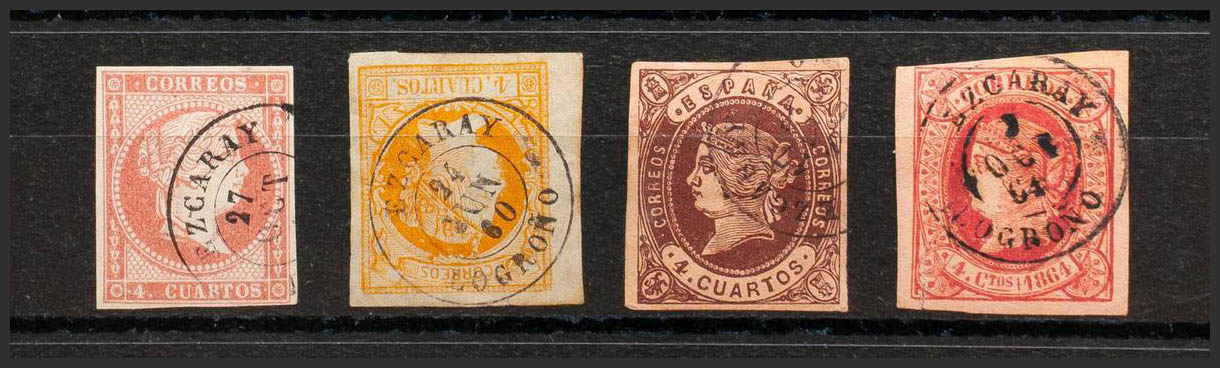 48, 52, 58, 64. (1855ca). Conjunto de cuatro sellos del 4 cuartos rojo, amarillo, castaño y rosa, inutilizados con matasello EZCARAY / LOGROÑO. MAGNIFICO.