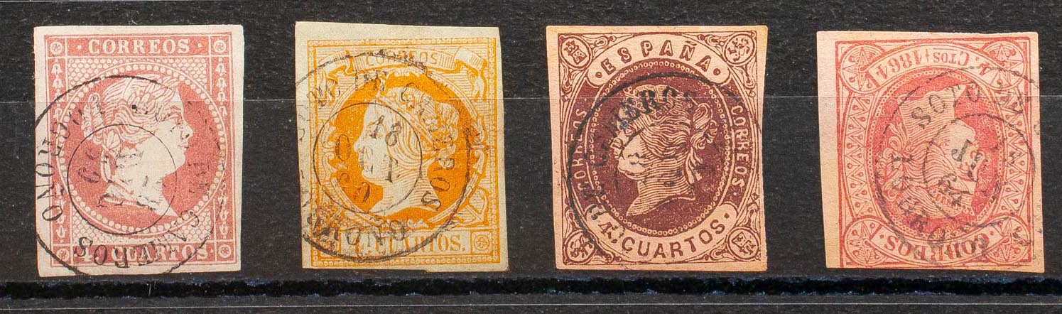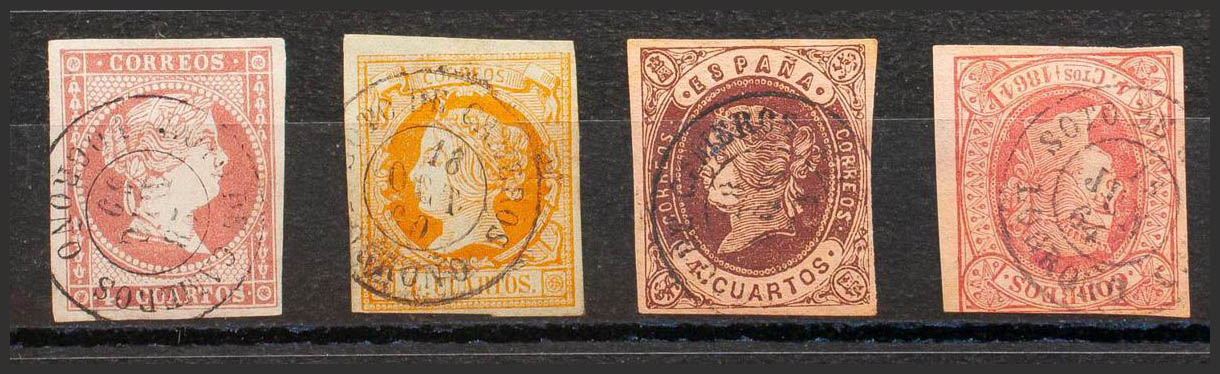 48, 52, 58, 64. (1855ca). Conjunto de cuatro sellos del 4 cuartos rojo, amarillo, castaño y rosa, inutilizados con matasello SOTO DE CAMEROS / LOGROÑO. MAGNIFICO.