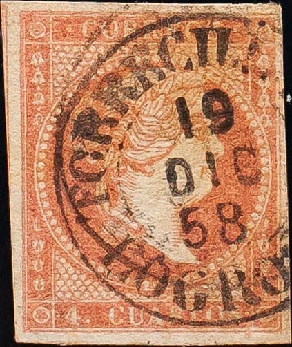 48. 1855. 4 cuartos rojo. Matasello TORRECILLA DE C. / LOGROÑO (Tipo I). MAGNIFICO.