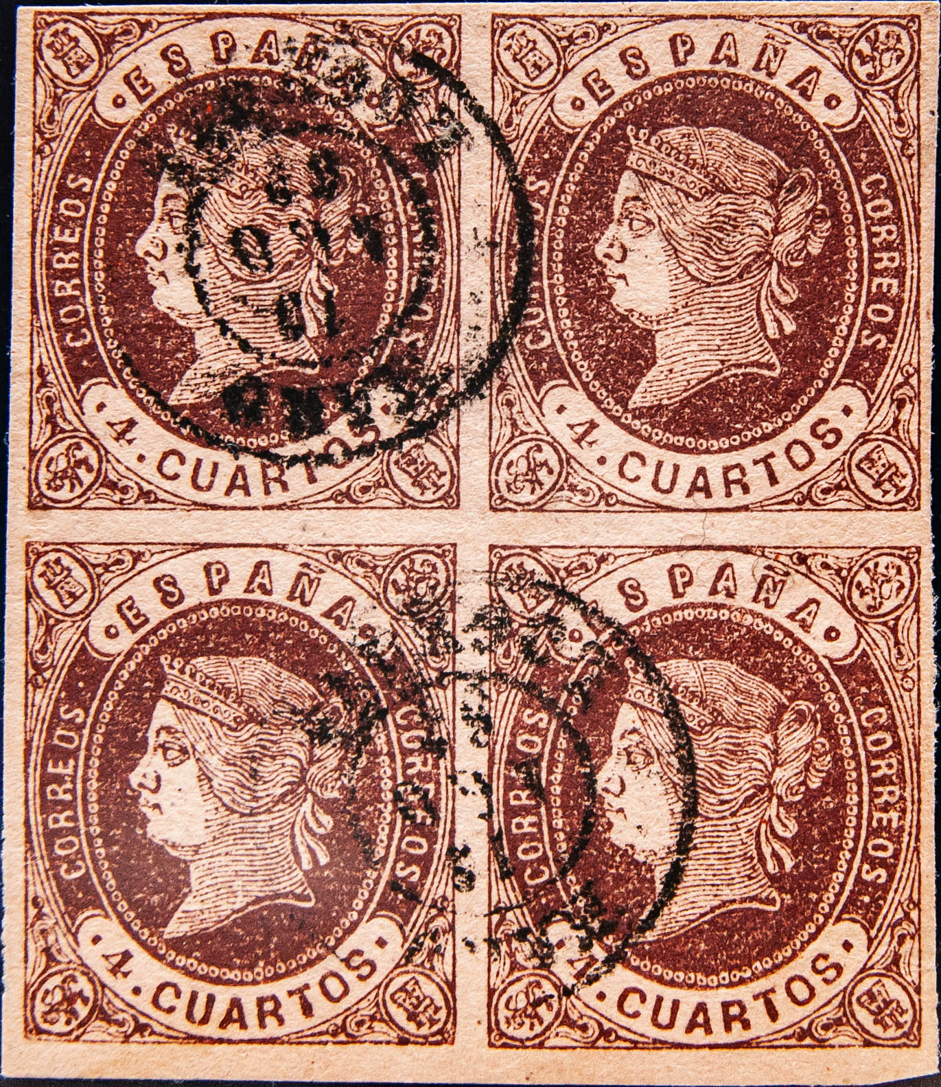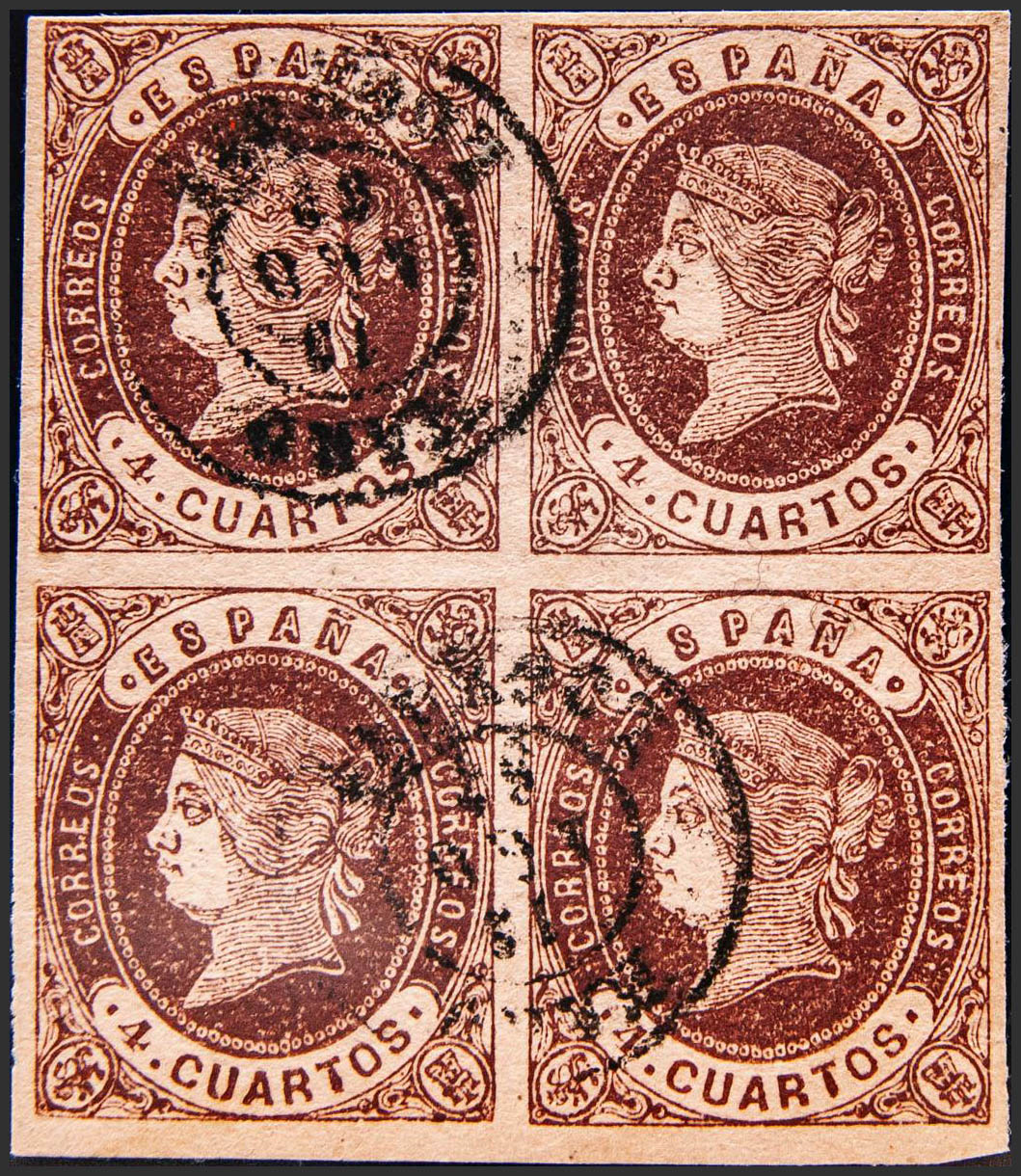 58(4). 1862. 4 cuartos castaño, bloque de cuatro. Matasello HARO / LOGROÑO. MAGNIFICO.