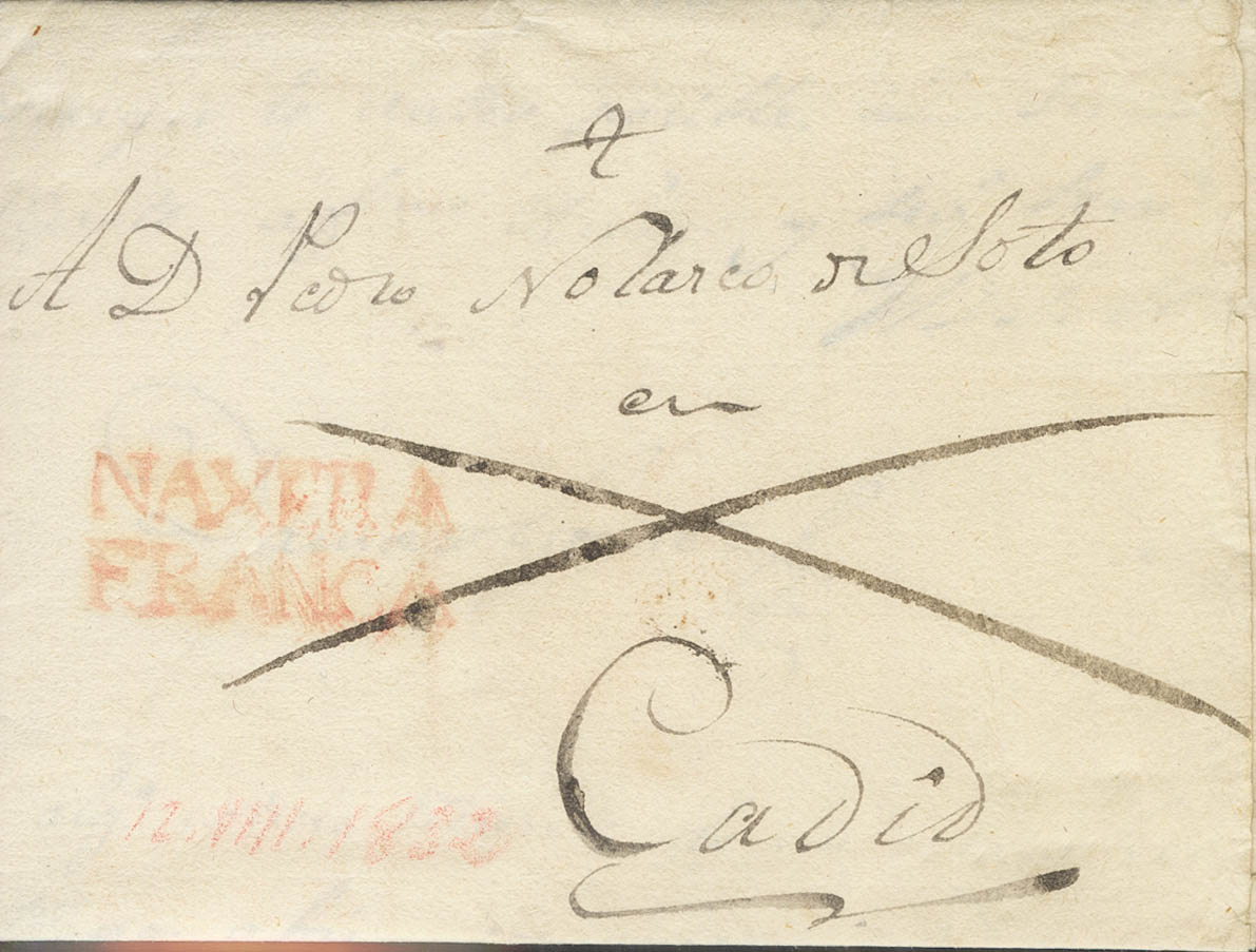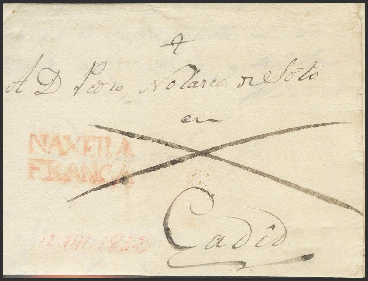 1832. ALESANCO (LA RIOJA) a CADIZ. Marca NAXERA / FRANCA, de Nájera (P.E.6) edición 2004. MAGNIFICA Y MUY RARA.