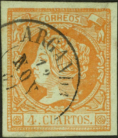 52. 1860. 4 cuartos amarillo. Matasello ARGANDA / MADRID.