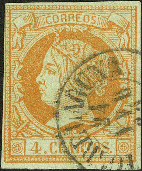 52. 1860. 4 cuartos amarillo. Matasello TORRELAGUNA / MADRID.