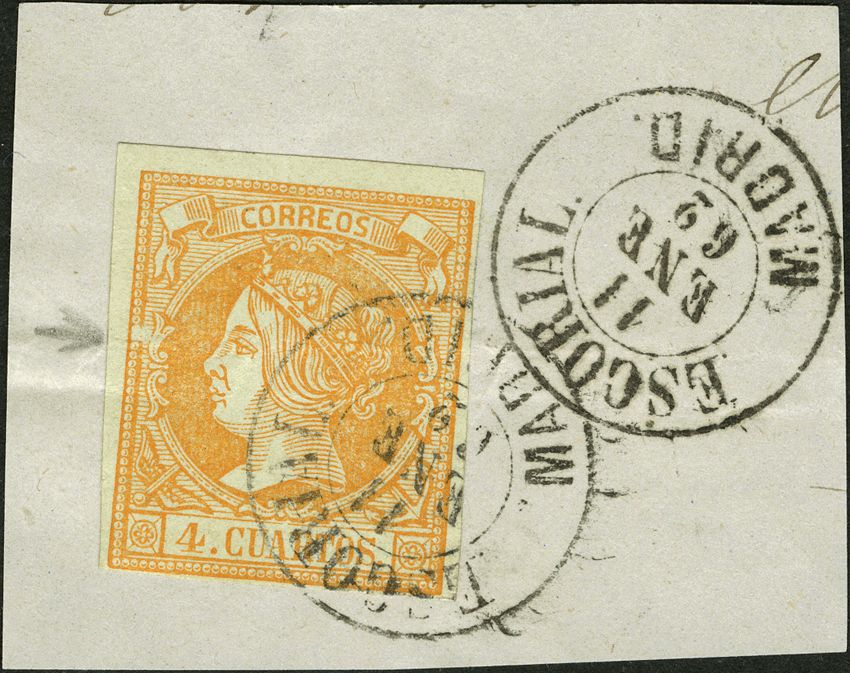 △ 52. 1860. 4 cuartos amarillo, sobre fragmento. Matasello ESCORIAL / MADRID. LUJO.