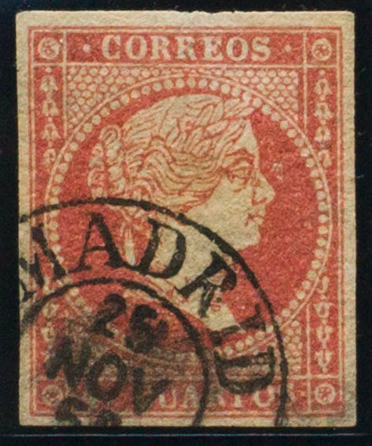 44. 1855. 4 cuartos rojo. Matasello MADRID / (1) (Tipo I). MAGNIFICO Y RARO.