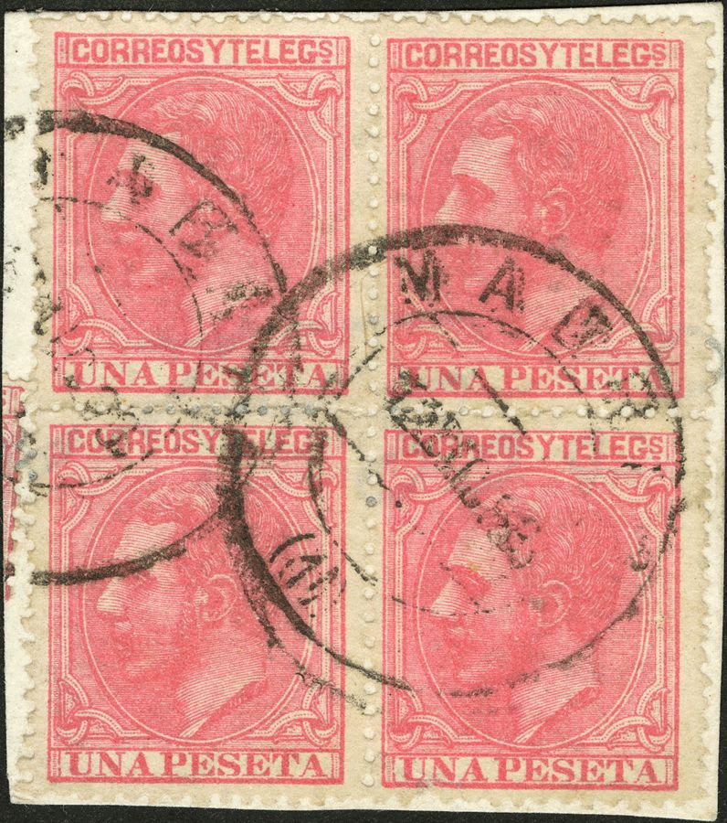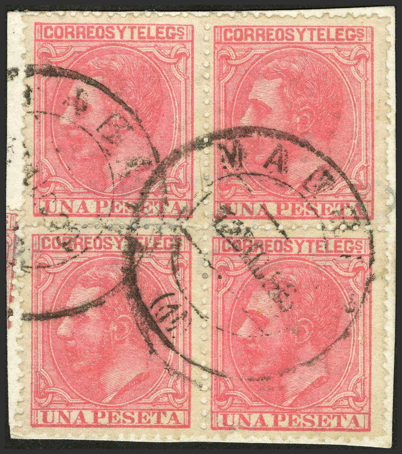 207(4). 1879. 1 pts rosa, bloque de cuatro. Matasello MADRID / (1). MAGNIFICA.