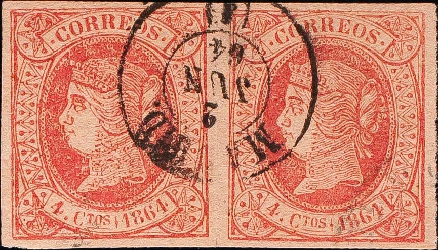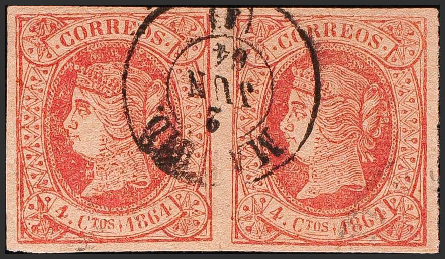 64(2). 1864. 4 cuartos rosa, pareja. Matasello MADRID / (1). MAGNIFICA Y MUY RARA.
