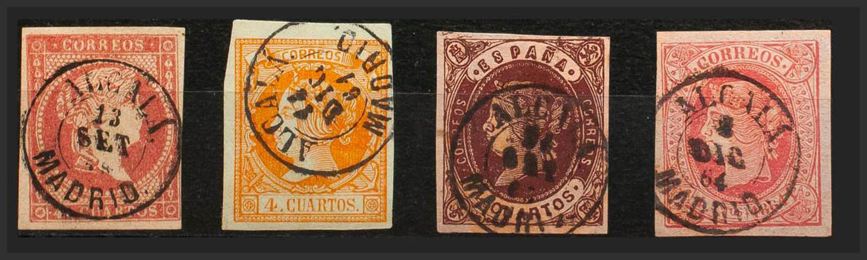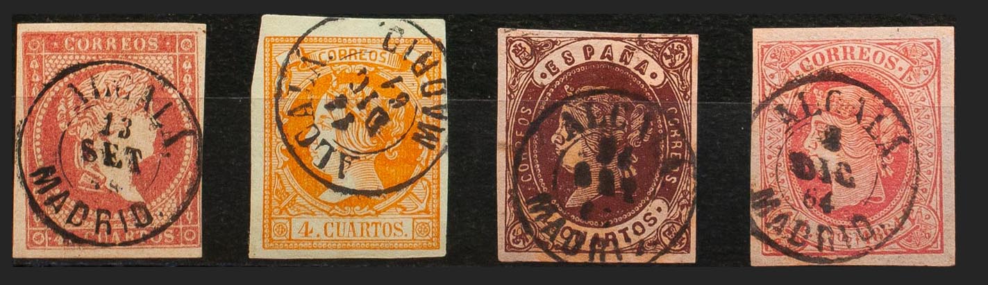 48, 52, 58, 64. (1855ca). Conjunto de cuatro sellos del 4 cuartos rojo, amarillo, castaño y rosa, inutilizados con matasello ALCALA / MADRID. MAGNIFICO.