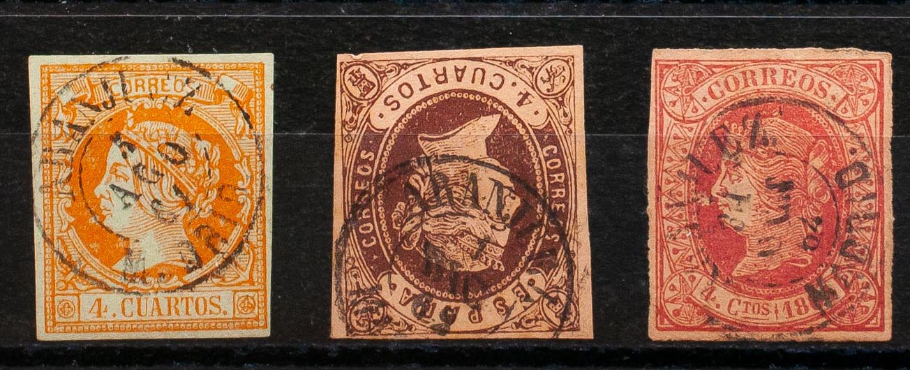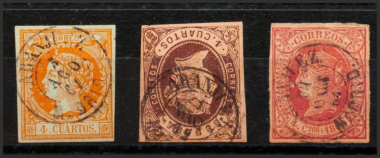 52, 58, 64. (1860ca). Conjunto de tres sellos del 4 cuartos amarillo, castaño y rosa, inutilizados con el matasello ARANJUEZ / MADRID. MAGNIFICO.