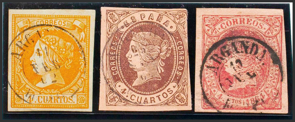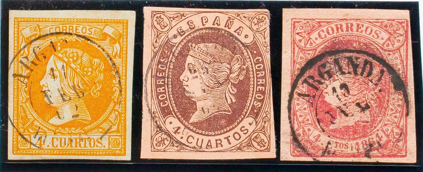 52, 58, 64. (1860ca). Conjunto de tres sellos del 4 cuartos amarillo, castaño y rosa, inutilizados con el matasello ARGANDA / MADRID. MAGNIFICO.