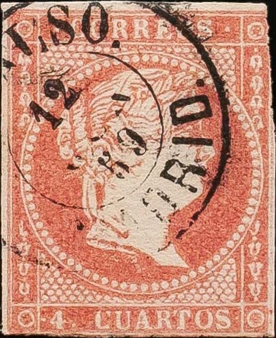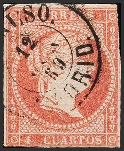 48. 1855. 4 cuartos rojo. Matasello CADALSO / MADRID. BONITO Y MUY RARO.
