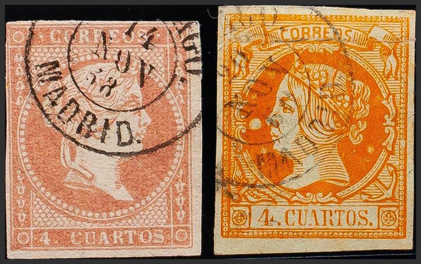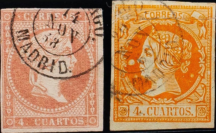 48, 52. 1855. Conjunto de dos sellos del 4 cuartos rojo y 4 cuartos amarillo, inutilizados con matasello BUITRAGO / MADRID. MAGNIFICO.