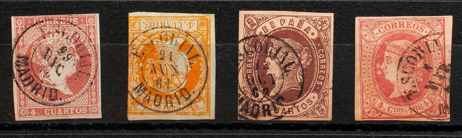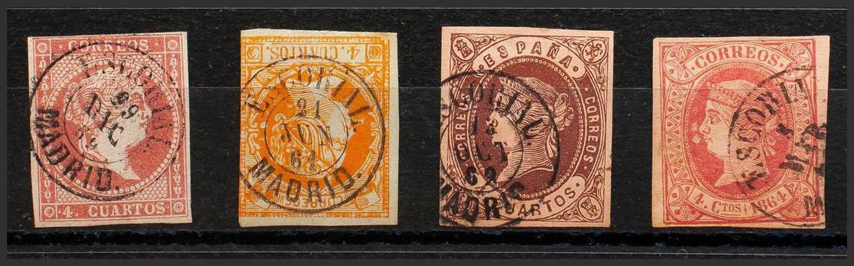 48, 52, 58, 64. (1855ca). Conjunto de cuatro sellos del 4 cuartos rojo, amarillo, castaño y rosa, inutilizados con matasello ESCORIAL / MADRID. MAGNIFICO.