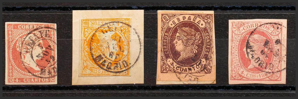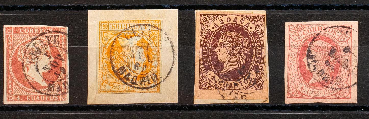 48, 52, 58, 64. (1855ca). Conjunto de cuatro sellos del 4 cuartos rojo, amarillo, castaño y rosa, inutilizados con matasello GETAFE / MADRID. MAGNIFICO.