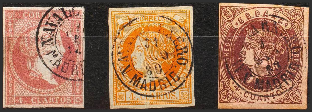 48, 52, 58. (1855ca). Conjunto de tres sellos del 4 cuartos rojo, amarillo y castaño, inutilizados con matasello NAVALCARNERO / MADRID. MAGNIFICO.