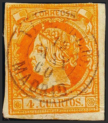 52. 1860. 4 cuartos amarillo. Matasello VILLAREJO / MADRID. MAGNIFICO Y MUY RARO.