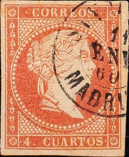 48. 1855. 4 cuartos rojo. Matasello SAN MARTIN / MADRID. MAGNIFICO Y MUY RARO.
