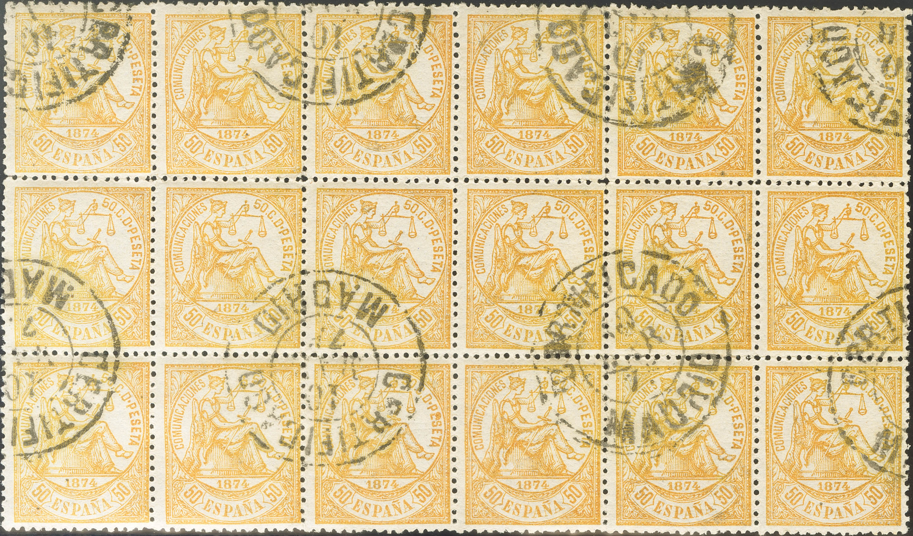 149(18). 1874. 50 cts amarillo, bloque de dieciocho. Matasello CERTIFICADO / MADRID. MAGNIFICO Y RARISIMO, MUY ESPECTACULAR Y ESPECIALMENTE EN UN BLOQUE DE ESTE TAMAÑO Y CON ESTE MATASELLO TAN INUSUAL.