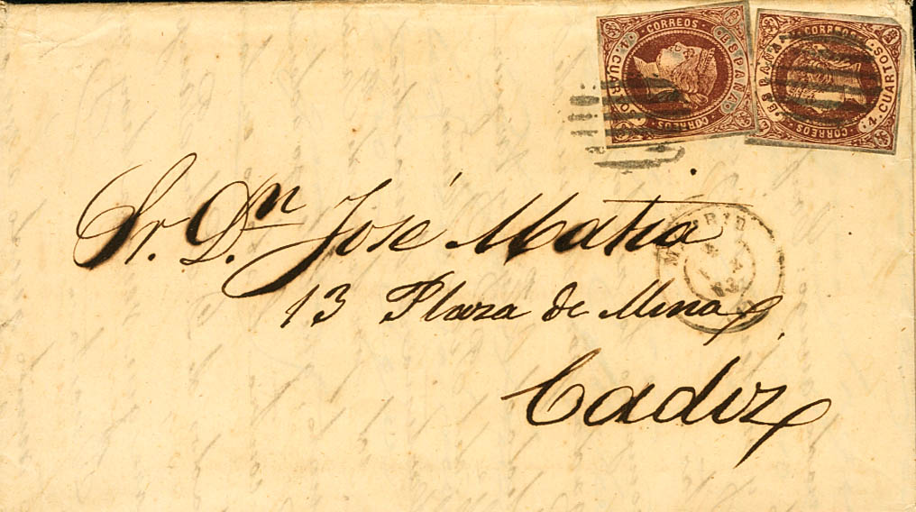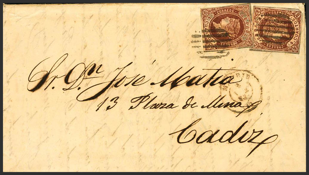 58(2). 1863. 4 cuartos castaño, dos sellos. MADRID a CADIZ. Matasello PARRILLA. MAGNIFICA Y RARA.