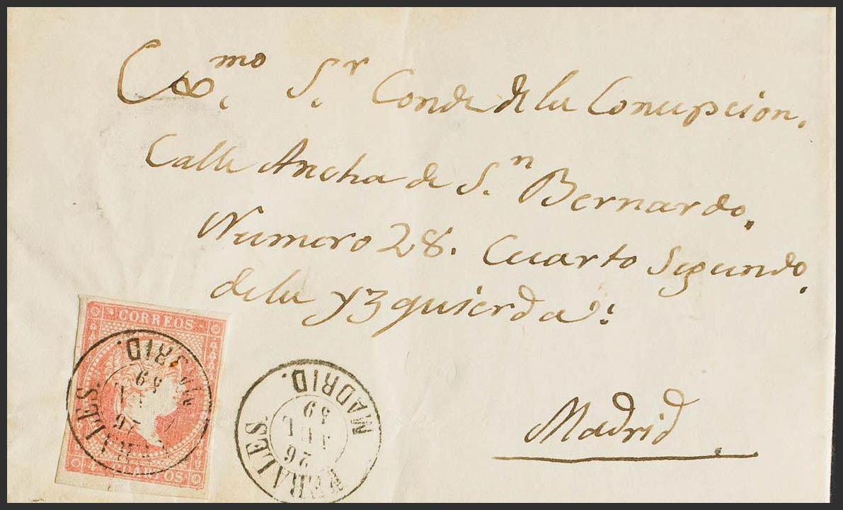 48. 1859. 4 cuartos rojo. PERALES DE TAJUÑA a MADRID. Matasello PERALES / MADRID. MAGNIFICA Y RARISIMA.