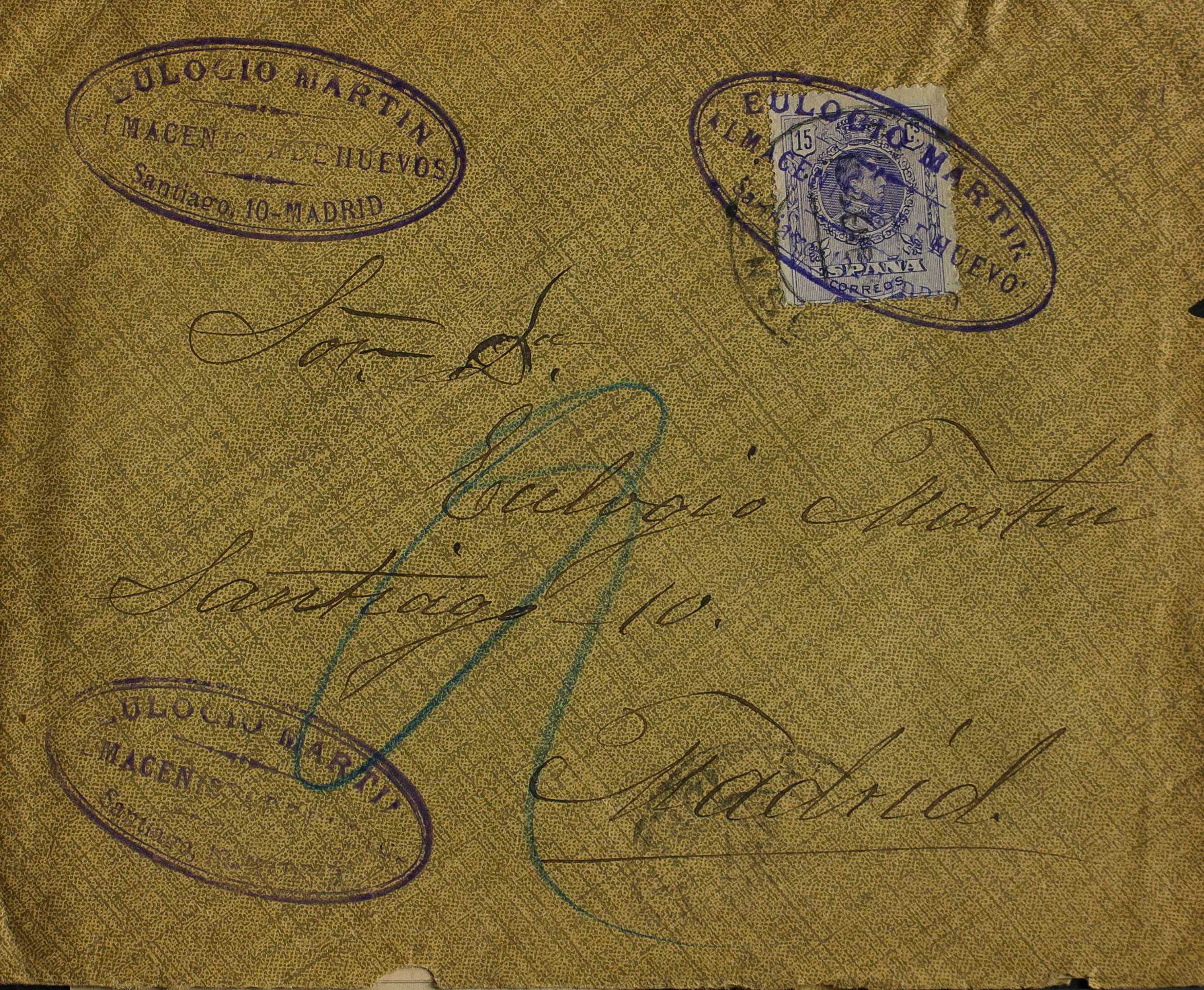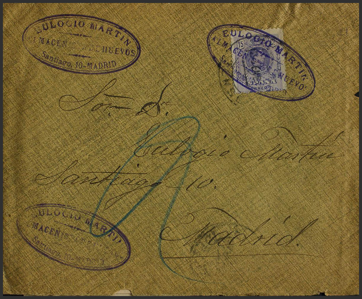 Madrid. Historia Postal. Matasello EULOGIO MARTIN / ALMACEN DE HUEVOS / MADRID. MAGNIFICA.